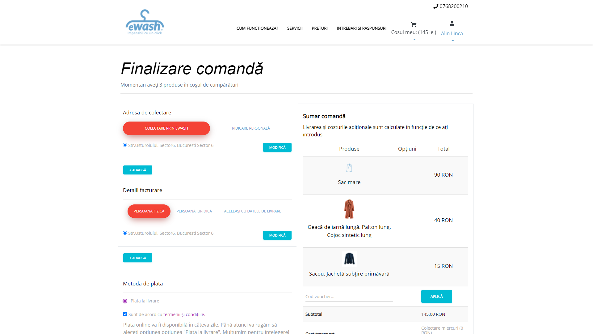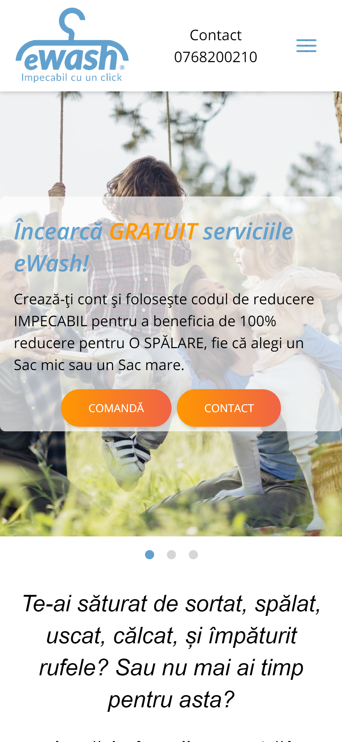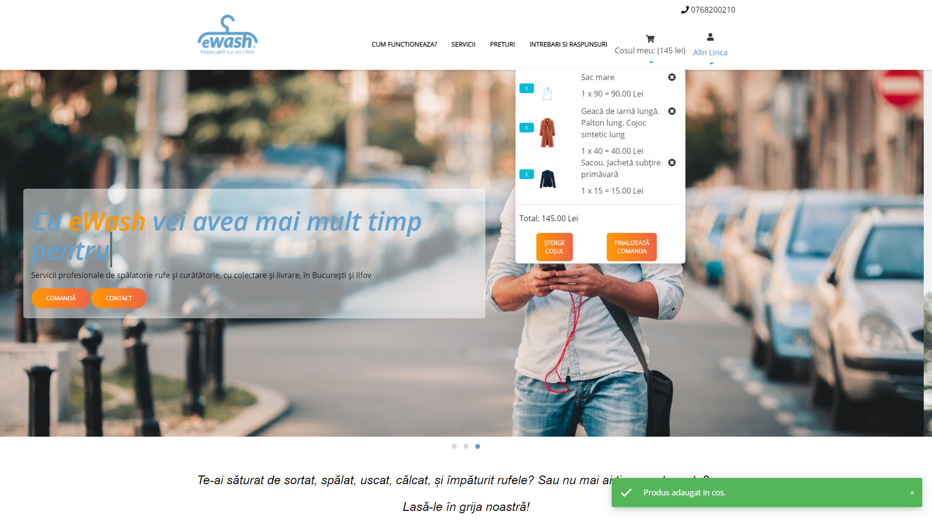 eWash este o platformă e-commerce dedicată serviciilor profesionale de spălătorie și curățătorie, cu preluare și livrare la domiciliu în București și Ilfov. Platforma digitalizează complet procesul de comandă, gestionare și livrare, oferind clienților o experiență simplă, rapidă și eficientă.