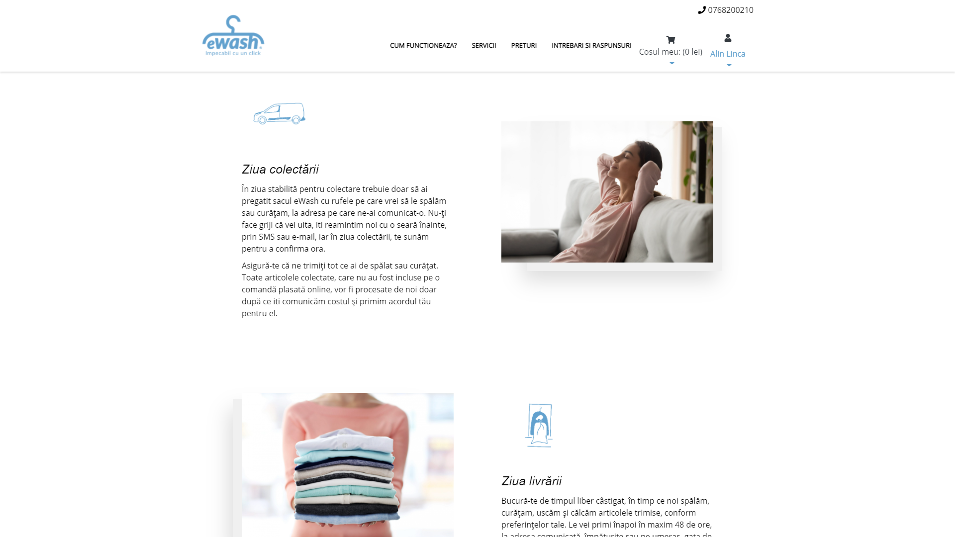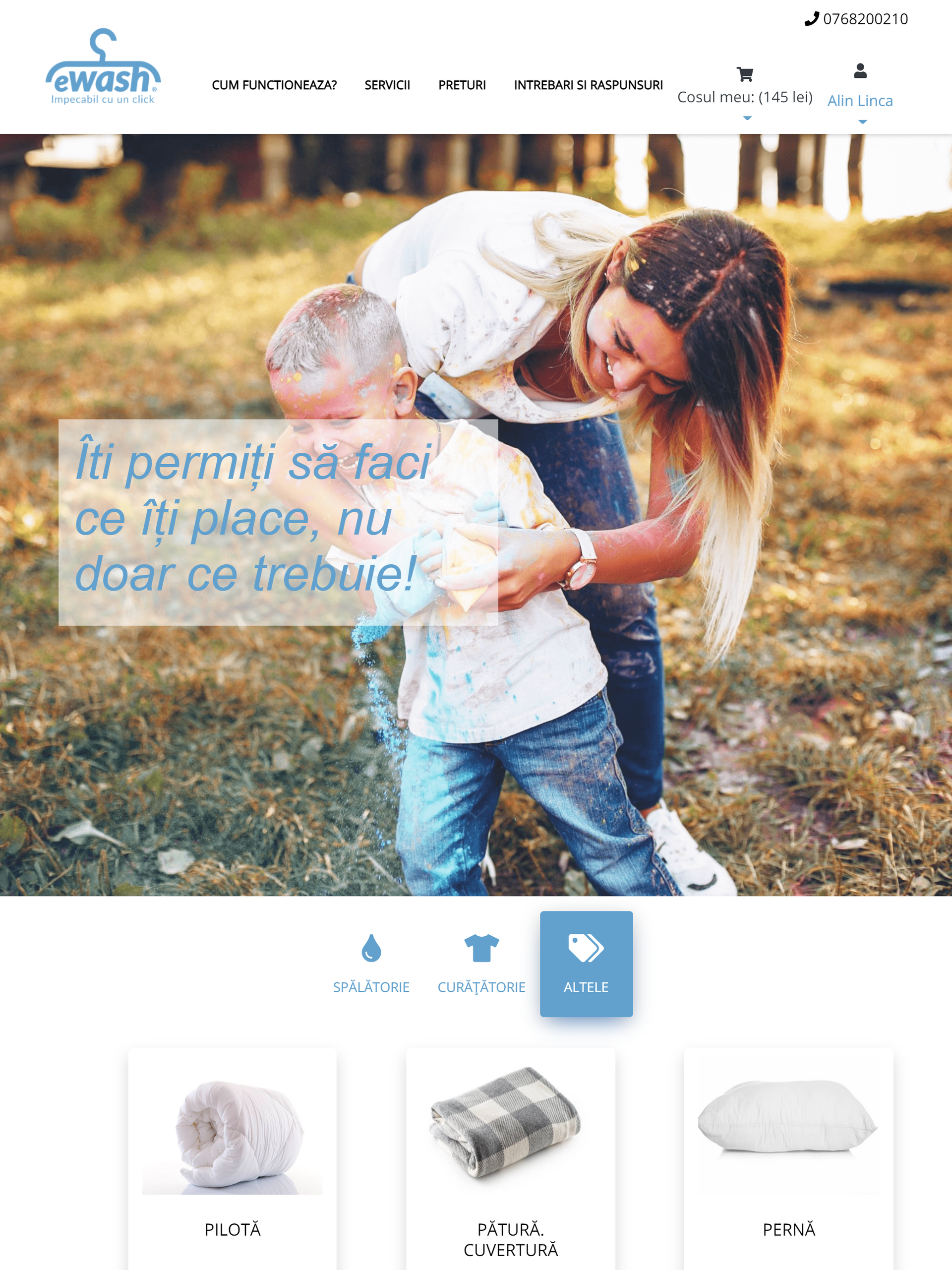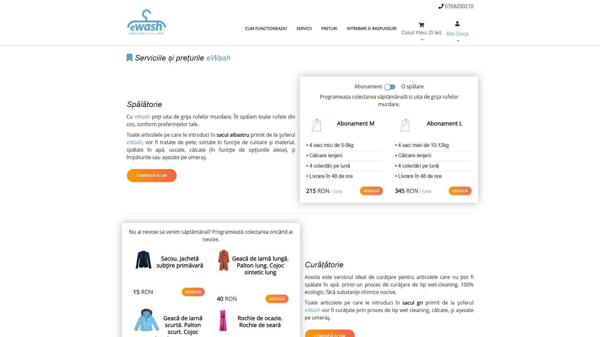 eWash este o platformă e-commerce dedicată serviciilor profesionale de spălătorie și curățătorie, cu preluare și livrare la domiciliu în București și Ilfov. Platforma digitalizează complet procesul de comandă, gestionare și livrare, oferind clienților o experiență simplă, rapidă și eficientă.