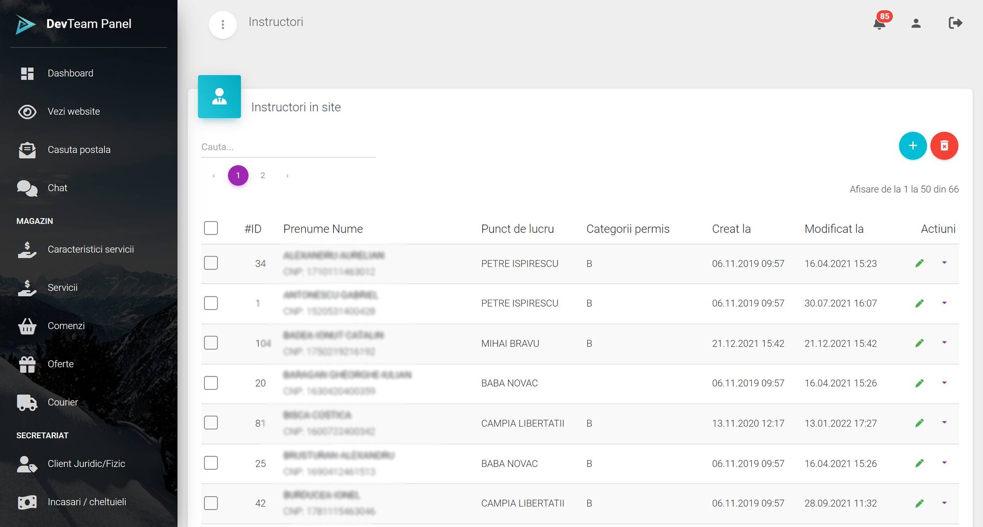 Administrare completă: puncte de lucru, categorii de permis, locații de examinare, serii și grupe de cursanți.